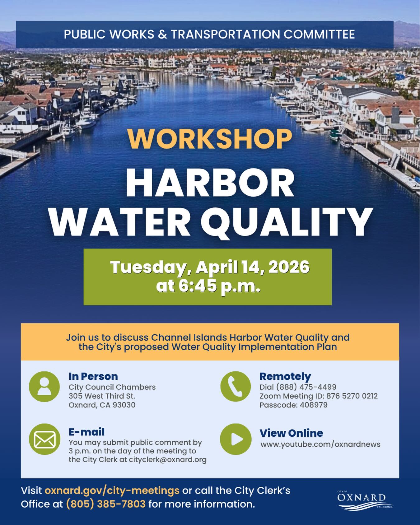 PLEASE JOIN your neighbors and City staff on Tuesday, April 14, 2026 at 6:45 p.m. at the Public Works and Transportation Committee for a workshop to discuss Channel Islands Harbor Water Quality and the City’s proposed Water Quality Implementation Plan.